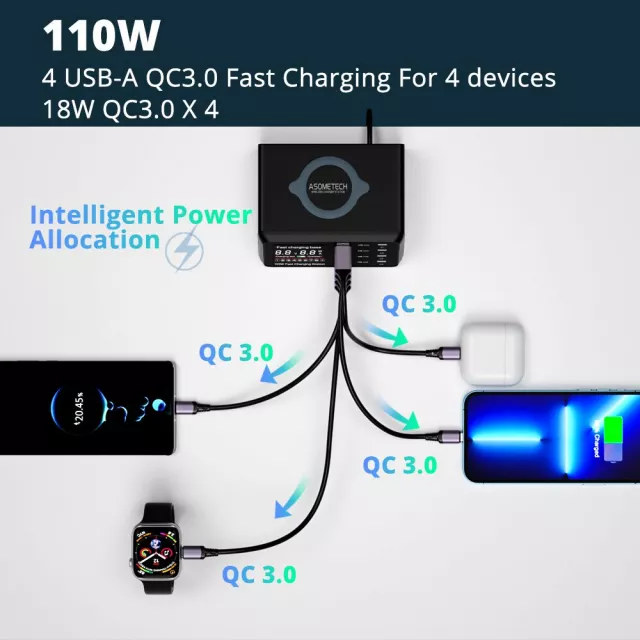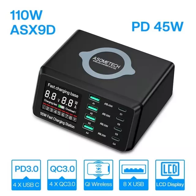 Say goodbye to tangled cables and slow charging speeds. This 110W 8-Port USB Charger with Wireless Charging Station is designed to power up to nine devices at once, making it the ultimate solution for families, offices, and tech lovers. With a total output of 110W, it combines 4 USB-A QC3.0 fast-charging ports, 4 USB-C PD3.0 ports, and a 15W max wireless charging pad, so you can quickly charge smartphones, tablets, laptops, earbuds, and more – all from one sleek station.