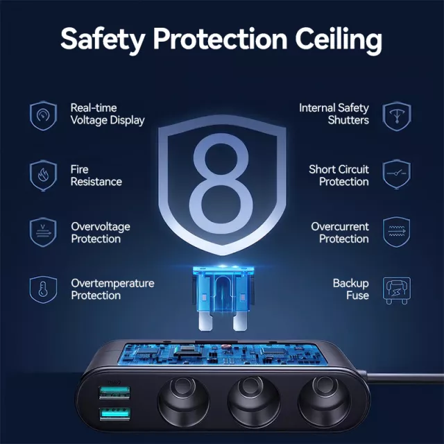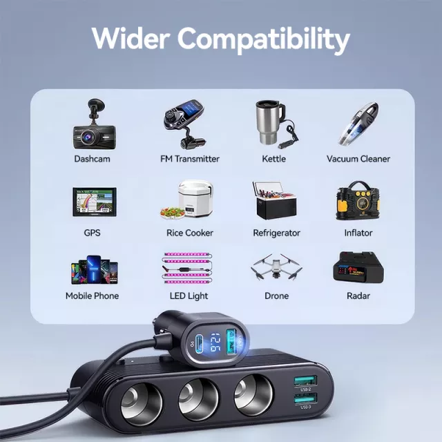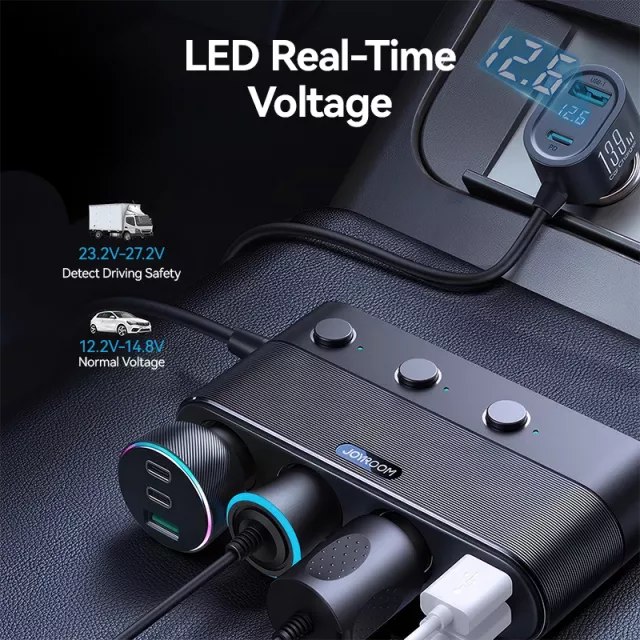 What makes this charger special isn’t just its power—it’s the attention to safety, convenience, and intelligent design. The LED display keeps you informed about your car’s battery status. Smart chips inside each port detect the optimal current for your device, ensuring fast and safe charging every time. Independent switches give you total control over each port—no more yanking cables or draining your battery unnecessarily.