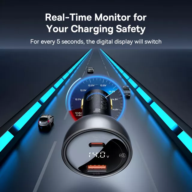 Equipped with PD 3.1 certification and advanced power management, it charges your laptop fully in around 1.6 hours — up to 40% faster than traditional chargers. The sleek digital display keeps you informed with real-time voltage, output, and charging status, giving you peace of mind and control while driving.
