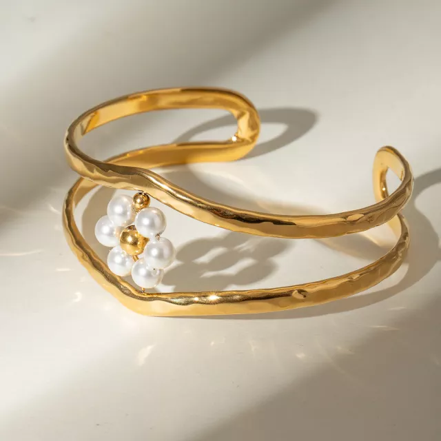 Grace your wrist with timeless charm and vintage sophistication. This 18K Gold Plated Double Layer Open Cuff Bracelet is designed to be more than just jewelry—it’s a statement piece. Featuring delicate imitation pearl flower accents on a classic double-line open cuff, this bracelet brings together elegance and durability in one chic design. The shimmering 18K gold-plated finish and fine geometric lines give it a refined, polished look that’s perfect for both everyday elegance and special occasions.