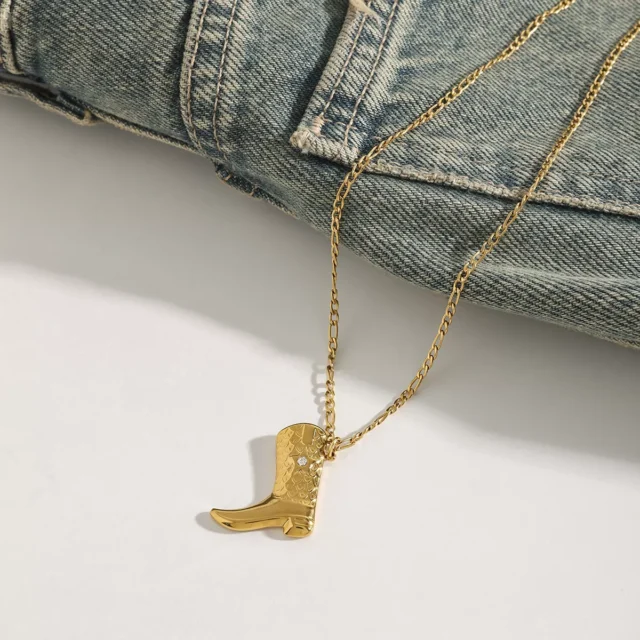 Elevate your accessory game with this stunning 18K gold plated stainless steel cowboy boot pendant necklace. A perfect blend of boldness and elegance, this necklace features a unique five-pointed star diamond pattern embedded on a cowboy boot pendant, making it a statement piece for any occasion. Whether you’re dressing up for a party, a night out, or simply want to add a touch of glamour to your everyday look, this necklace is the perfect choice.