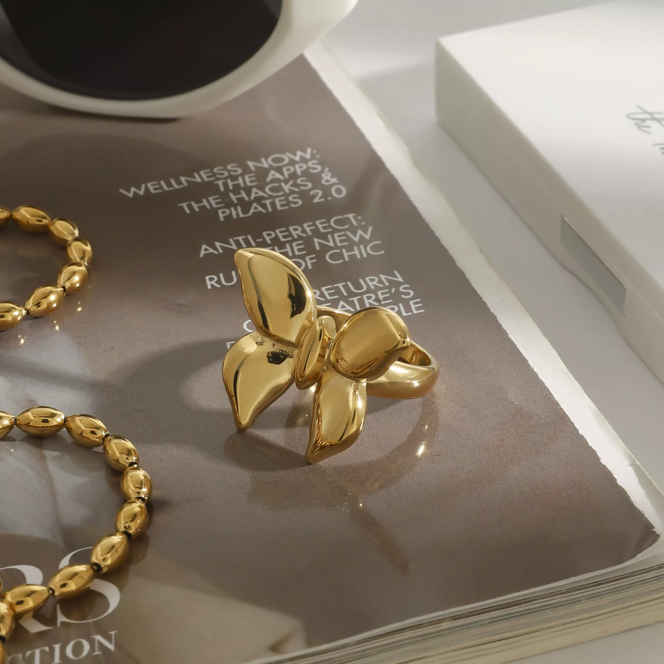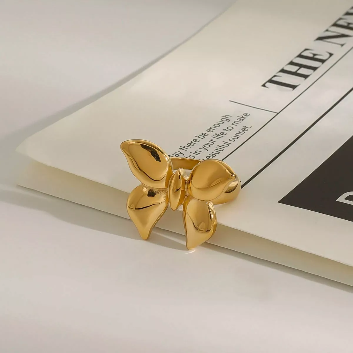 The ring features a sleek, smooth surface and is made from high-quality stainless steel with a lustrous 18K PVD gold plating. This process ensures that the color stays vibrant and long-lasting, so you can enjoy its beauty for years to come. Whether worn alone for a subtle statement or stacked with other rings for a bolder look, this butterfly ring brings a touch of sophistication and charm.