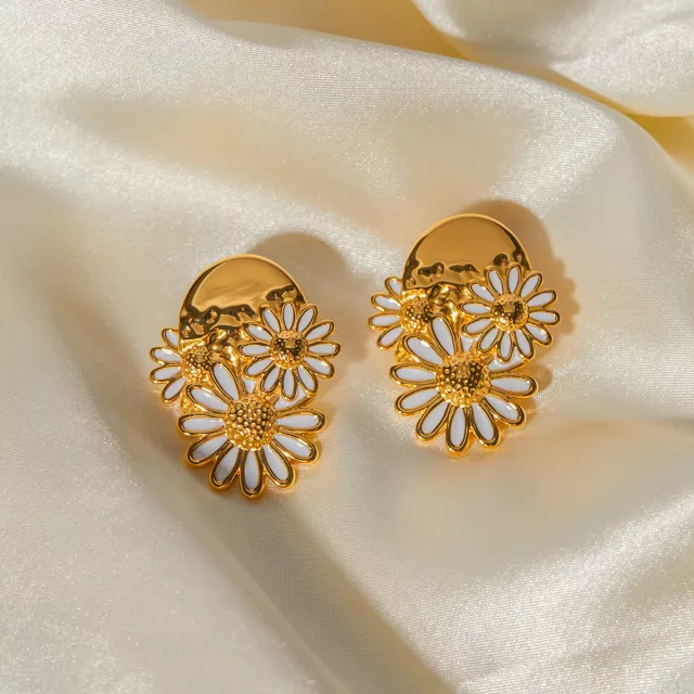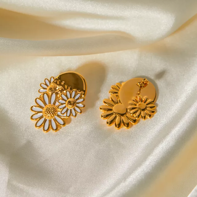 Crafted from premium stainless steel and finished with luxurious 18K PVD gold plating, these earrings are made to last. The white enamel drip detailing on each daisy petal adds a unique, contemporary touch that sets these earrings apart from ordinary florals. Hypoallergenic and nickel-free, they’re gentle on the skin and perfect for everyday use.