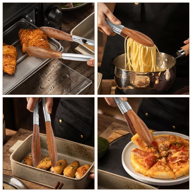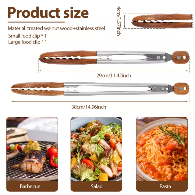 Made from premium treated walnut wood and rust-resistant stainless steel, these tongs are built to last. The natural wood tips are gentle on cookware surfaces, preventing scratches, while the stainless steel handles feature a non-slip, anti-scald design that keeps your hands safe and steady over the heat. With two sizes included—11.4 inches and 15 inches—you’ll have the right tool for every task, from serving appetizers to flipping hefty cuts on the grill.