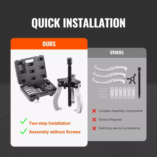 This 2-piece puller kit features durable, heat-treated screws and precision-crafted hooks and claws made from high-grade 45# steel. With reversible jaws and two sizes (3″ and 7″), you can handle both delicate and heavy-duty jobs. Tackle tight spaces with ease thanks to the reversible jaw design that offers access to small, narrow areas or larger components. Quick two-step setup saves time, reduces hassle, and eliminates the need for multiple fasteners.