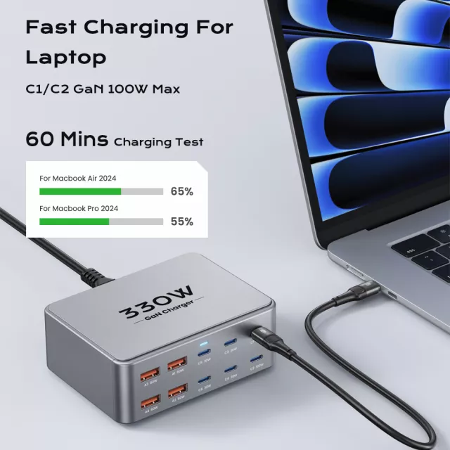 Say goodbye to messy cables and multiple chargers. This 330W GaN Multiport USB-C Fast Charging Station is designed to power all your devices at lightning speed from one compact hub. With 10 versatile ports, including 6 USB-C and 4 USB-A, it can charge laptops, smartphones, tablets, and more all at once. Thanks to advanced GaN technology, it delivers faster, cooler, and more efficient charging in a sleek, space-saving design.