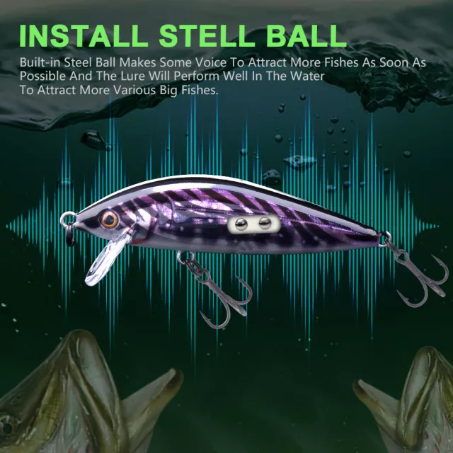 Whether you’re casting into lakes, rivers, reservoirs, or ocean rock spots, these jerkbaits are crafted to perform. Designed for top-to-midwater action, they dive from around 3 to 6 feet, thanks to their short diving lips. An internal steel ball system ensures long casting and creates subtle sound vibrations that attract nearby fish. With high-performance ABS plastic construction and razor-sharp treble hooks, these lures are built to land – and hold – your next big catch.