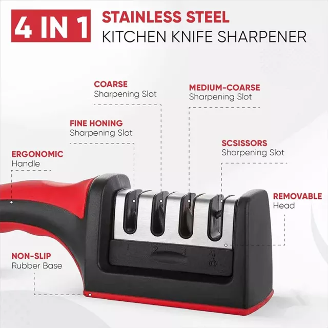 Bring your dull kitchen knives back to life with this 4-in-1 knife sharpener designed for everyday use. Whether you’re slicing vegetables, carving meats, or prepping a fresh fillet, this sharpening tool makes it easier, safer, and faster to achieve razor-sharp blades with minimal effort. Compact yet powerful, it’s a must-have for any kitchen — from casual home cooks to culinary enthusiasts.