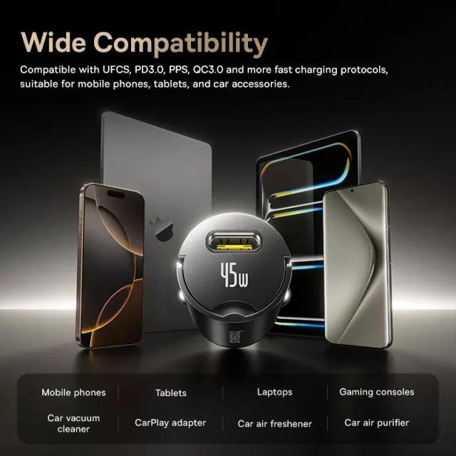 This mini powerhouse supports multiple fast charging protocols like USB Power Delivery, Qualcomm Quick Charge, Huawei FCP, and Samsung Adaptive Fast Charge. The smart chip inside recognizes your device and delivers the optimal current to ensure safe and efficient charging. With a high-output USB-C port, it offers up to 45W of power — perfect for phones, tablets, and even smaller laptops.