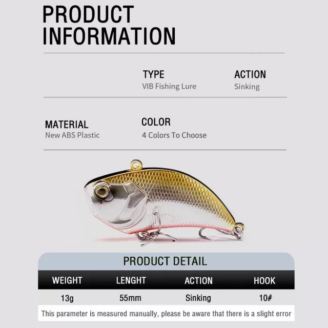 The 55mm 13g Rattling Sinking VIB Fishing Lure is built to help anglers land more trophy fish. Its compact size and realistic design mimic the movements of baitfish, making it irresistible to predators like bass, pike, and walleye. Designed for both freshwater and saltwater fishing, this lure delivers an exceptional sinking action combined with a strong vibration that triggers aggressive strikes even from cautious fish.