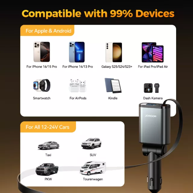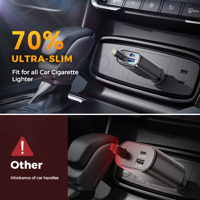 Stay powered up on every trip with this ultra-slim 57W retractable car charger. Designed for maximum convenience, it’s compact, lightweight, and fits perfectly in even the narrowest car cigarette lighter spaces. With a smart 3-in-1 design, it features a built-in retractable cable and two additional ports, letting you charge up to three devices at once. Supporting USB-C and USB-A fast charging, it delivers full-speed power to iPhones, Android devices, tablets, and more—making it an essential car accessory for busy drivers and families on the go.