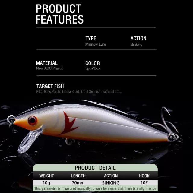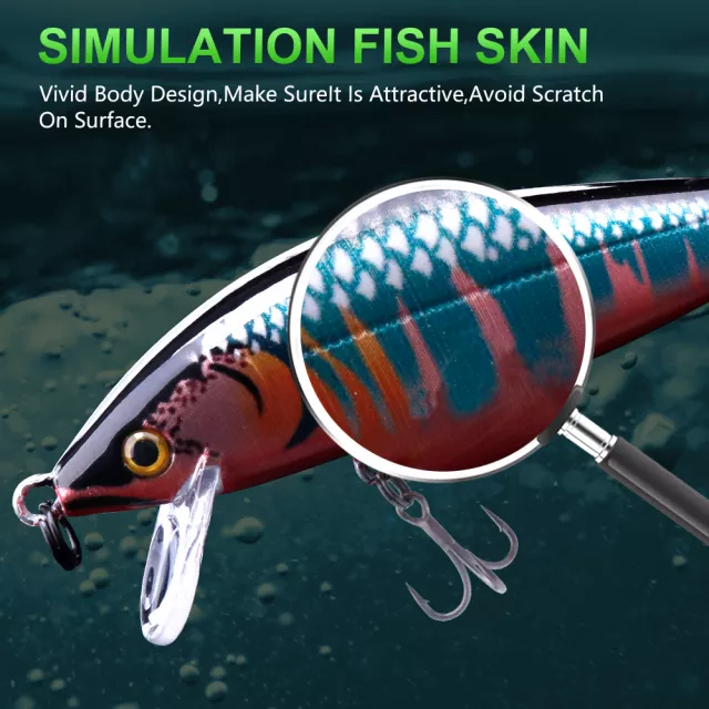 Get ready to elevate your fishing game with this 5-piece Minnow Fishing Lure Set. Each lure in the kit is designed to mimic real fish with astonishing detail — thanks to lifelike 3D eyes, vibrant patterns, and a holographic finish that reflects light just like a live baitfish. Whether you’re fishing in freshwater or saltwater, these slow-sinking crankbaits deliver irresistible motion that drives game fish wild.
