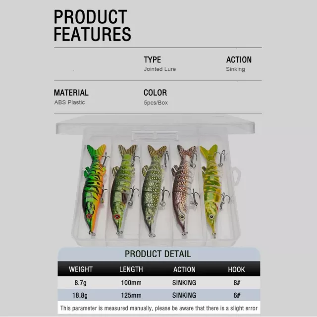 Take your fishing game to the next level with this set of 5 lifelike pike wobblers. Each lure is expertly crafted with an 8-segment jointed body that moves like a real fish, creating irresistible S-shaped swimming action at any speed. With two size options – 4 in (10 cm) and 5 in (12.5 cm) – these slow-sinking hard baits are perfect for attracting predatory fish in both freshwater and saltwater.