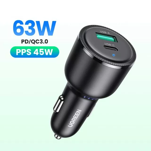 Stay charged wherever the road takes you with this high-speed 63W car charger. Designed for ultimate convenience and efficiency, it delivers blazing-fast power to keep your iPhone, Samsung, Xiaomi, tablets, and other USB-powered devices ready to go. With dual USB-C and USB-A ports, you can charge two devices at once without slowing down. Its advanced PD 3.0 and QC 3.0 technology ensures rapid charging for the latest smartphones, providing up to 60 percent charge in just 30 minutes for iPhone 14 and Samsung devices.