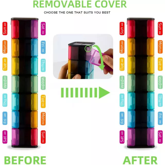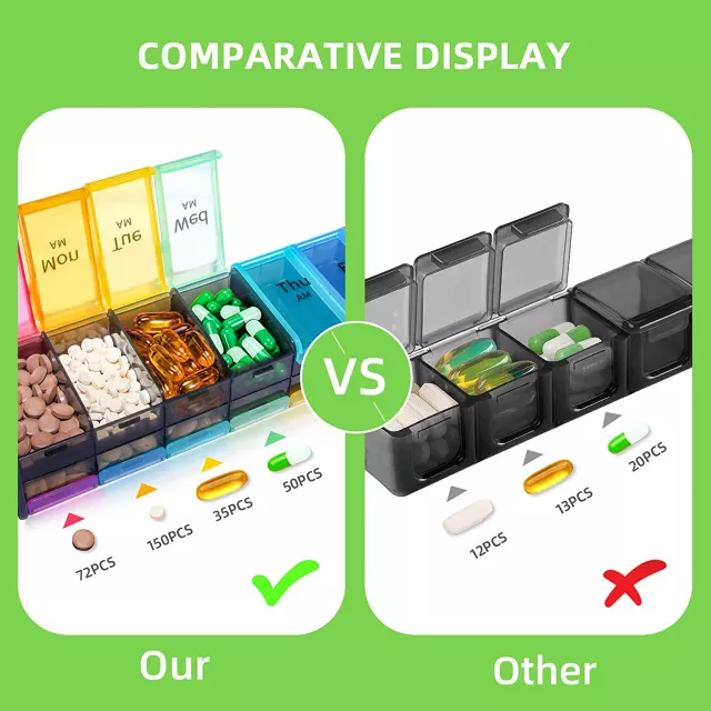 Built with convenience and clarity in mind, each day is divided into AM and PM slots, clearly labeled and color-coded, so you never miss a dose. The extra-large compartments are big enough to fit multiple oversized pills, letting you plan an entire week’s worth of supplements, medications, or vitamins in one go. Plus, the compact size makes it perfect to toss in your bag when you’re on the move.