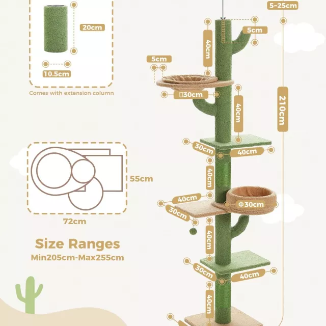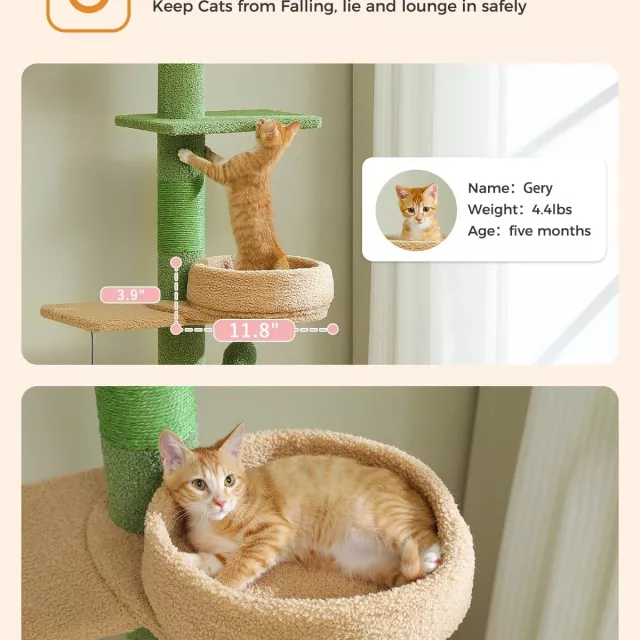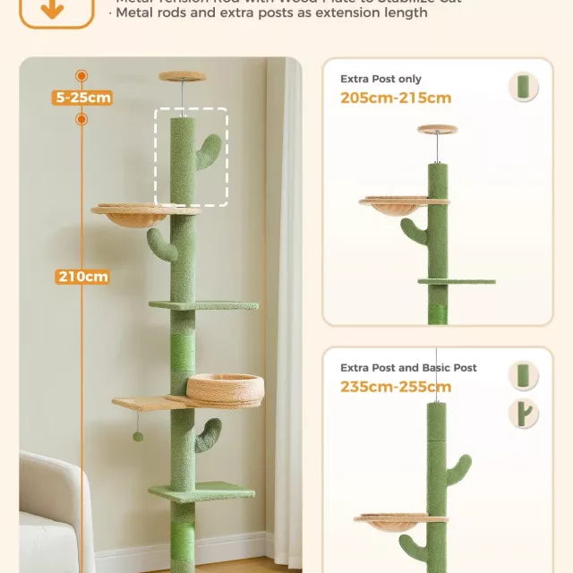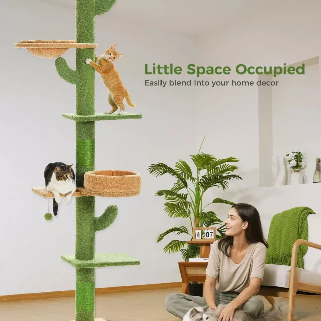 The unique cactus shape and vibrant green color turn this cat tree into a statement piece that blends seamlessly into any home with a touch of fun. Its ability to adapt to different ceiling heights, paired with a secure tie-bar for added safety, sets it apart from ordinary cat towers. It’s not just a place for your cat to play — it’s a place for them to thrive.