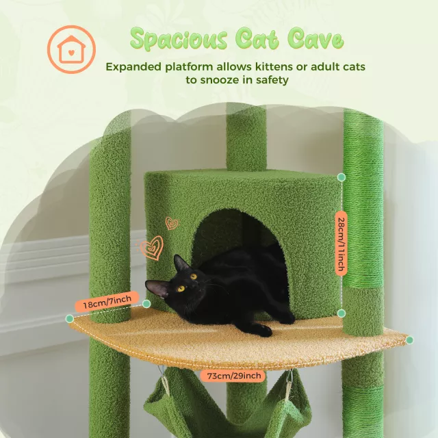 This indoor cat tower features an elegant wood design in brown or green tones, seamlessly blending with your interior décor while offering your pets a world of enrichment. Its thoughtfully crafted layout includes 9 sisal-wrapped scratching poles, 2 dangling pom-poms, a cozy condo, multiple perches, a soft hammock, and even a transparent acrylic nest that doubles as a luxurious observation deck. Strong, stylish, and space-saving, it’s built for safety and fun all in one.