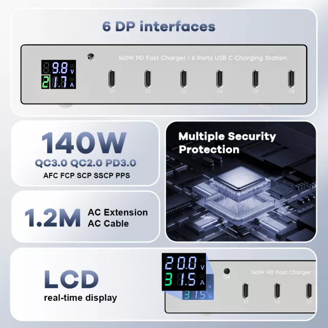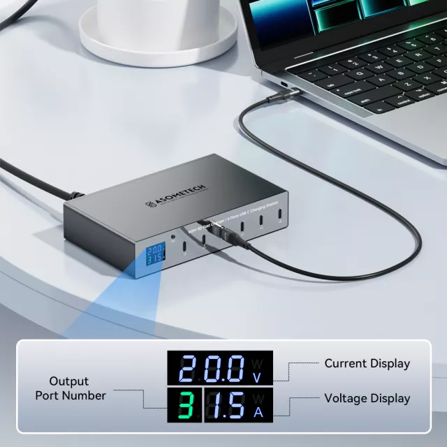 The ASOMETECH 140W 6-Port USB-C PD Fast Charging Station is the ultimate solution for charging multiple devices at once. With six powerful USB-C ports, each capable of delivering up to 30W, you can quickly charge your smartphones, tablets, laptops, game consoles, cameras, and more—all from one sleek and compact charging hub. Its smart LED display shows real-time voltage and current for each port, so you always know your devices are charging safely and efficiently.