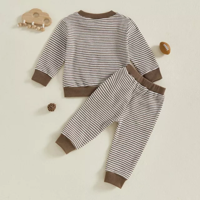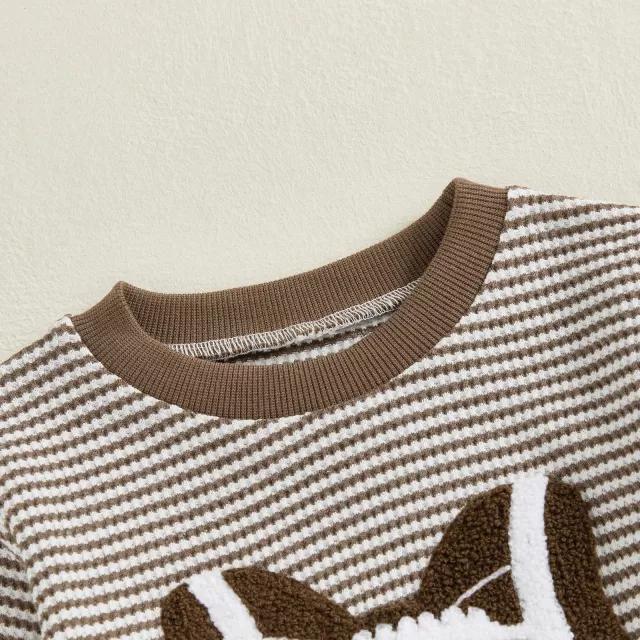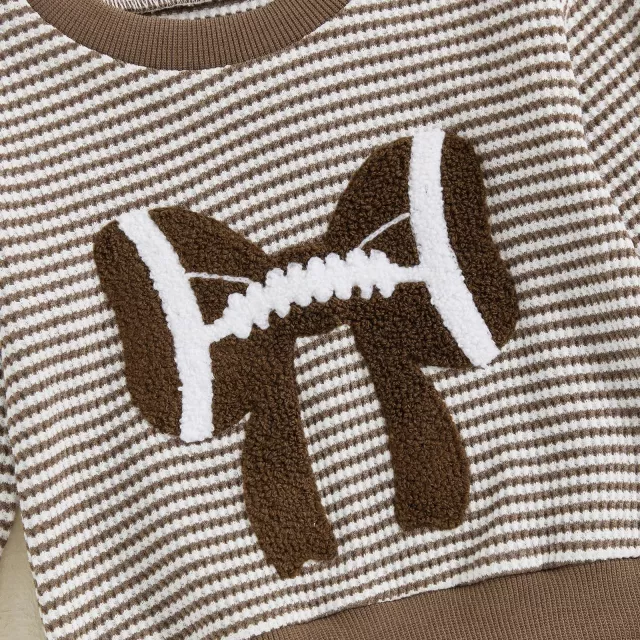 Crafted from a gentle blend of 50% cotton and 50% polyester, this set ensures all-day comfort for your baby’s delicate skin. The long sleeve top features an elegant rugby-style design with a sweet bow embroidery on the front, giving it a classic yet fun vibe. Paired with comfy striped pants that offer just the right stretch, your toddler will look adorable and feel free to move around with ease.