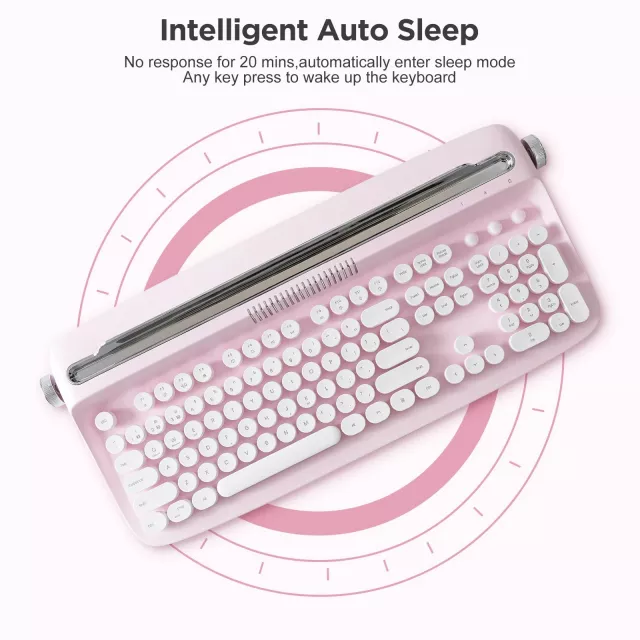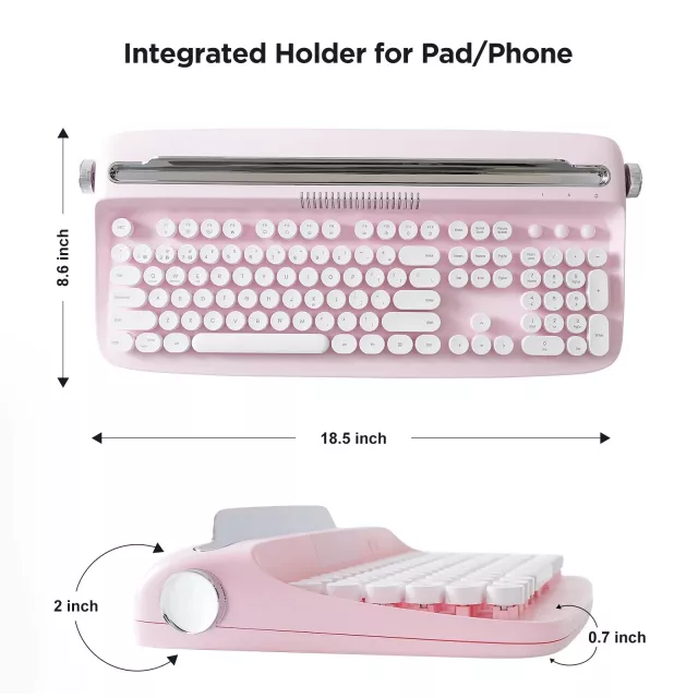 Inspired by classic typewriters, this keyboard features rounded, soft-touch keycaps that bring vintage vibes to your fingertips. Its full 104-key layout includes a number pad, making it ideal for productivity, content creation, or casual browsing. The integrated device stand holds your phone or tablet while you type, freeing up desk space and keeping everything in view. Adjustable feet let you tilt the keyboard for better wrist comfort during long typing sessions.