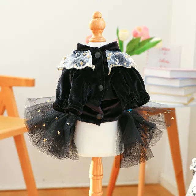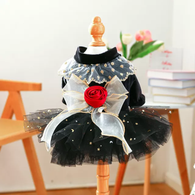 This dog dress is made with breathable mesh and delicate tulle, making it ideal for warm autumn months. The bodice is crafted with soft black velvet-like fabric, gently hugging your dog’s chest without restricting movement. A shimmering puff skirt adds a fairy-tale finish to the look, while the solid black color keeps it sleek and versatile.