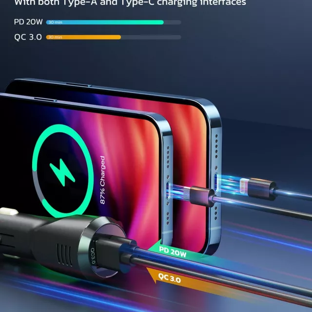With dual fast-charging ports (QC3.0 and PD20W), this transmitter ensures your phone, tablet, or GPS device stays powered without slowing you down. The easy-to-read LED display, vibrant atmosphere lighting, and vent-mounted design put safety and style in focus—so you can keep your eyes on the road and your hands on the wheel.