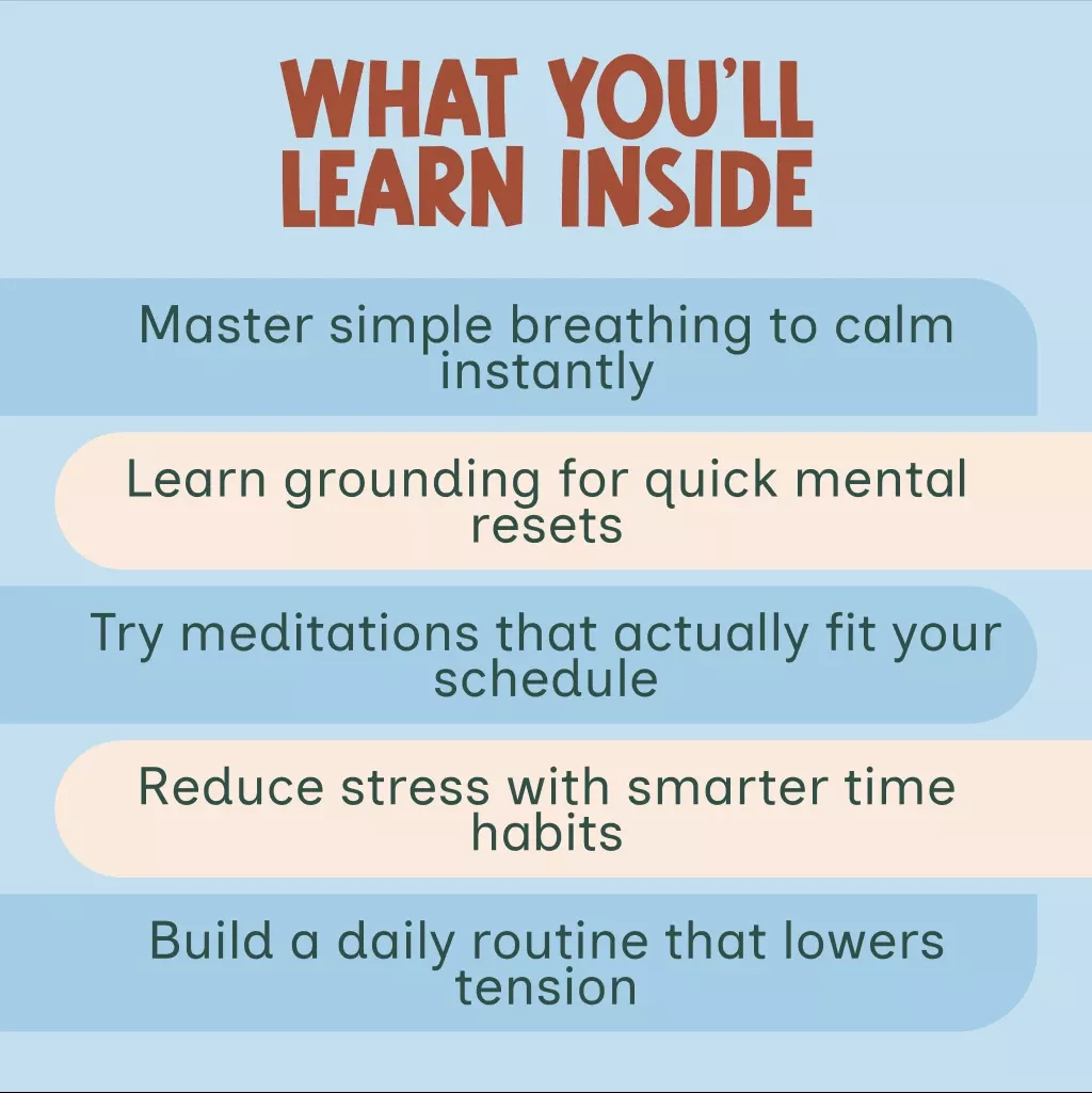 Unlike other generic resources, this informative guide brings together actionable breathing exercises, quick meditations, grounding techniques, and time management tips to reduce stress—all in one calming, easy-to-follow format. It’s more than information—it’s transformation in your back pocket.