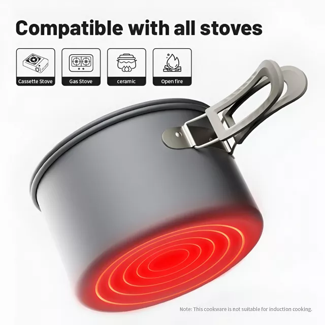 Enjoy the freedom of cooking in the great outdoors with this versatile camping cookware set. Designed for outdoor lovers, this compact and lightweight set makes it easy to prepare hot meals and drinks whether you are camping, hiking, backpacking, or having a picnic. Made from durable aluminum alloy, it is safe, sturdy, and built to handle boiling water over an open flame. The non-stick coating ensures easy cooking and quick cleaning, so you can spend more time enjoying nature and less time scrubbing dishes.