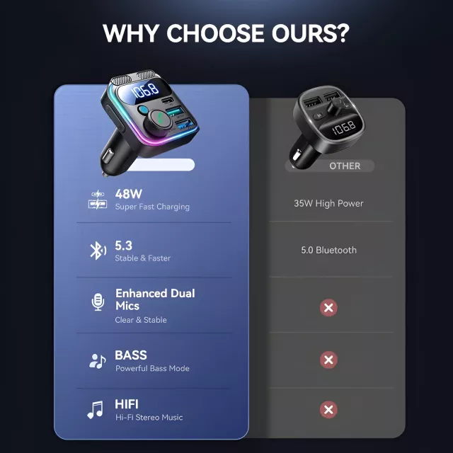 This transmitter is loaded with the latest Bluetooth 5.3 technology for faster, more stable connections. It supports both Bluetooth and U-disk playback, giving you two easy ways to stream your music. The vivid 7-color LED light bar adds a modern touch to your car interior, making it easy to operate even at night. And with the LED voltage display, you’ll always know your car battery’s status.