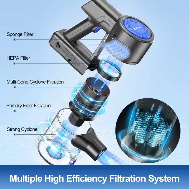 This vacuum is equipped with a 5-stage high-efficiency filtration system that captures up to 99.99% of dust particles as small as 0.1 microns. The innovative multi-cone cyclone design reduces filter maintenance and helps deliver cleaner air, making it ideal for households with children, seniors, or allergy sufferers.