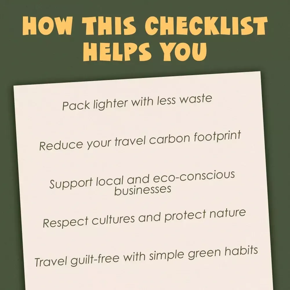 Perfect for frequent flyers, backpackers, digital nomads, eco-tourists, and anyone who wants to explore responsibly. Whether you’re planning a weekend getaway or a month-long adventure, this checklist helps you make meaningful, planet-friendly decisions every step of the way.