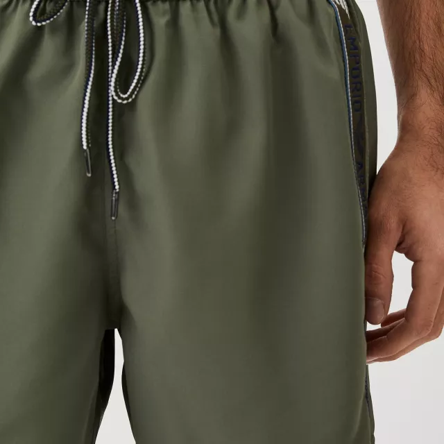 Crafted for the modern man, these swim shorts are part of Emporio Armani’s coveted Spring/Summer collection. The lightweight, quick-drying 100% polyester material keeps you comfortable all day long, whether you’re diving into the ocean or enjoying a stroll along the boardwalk. Thoughtfully designed with practical front pockets and a secure lace-up fastening, these shorts offer both convenience and a customizable fit.