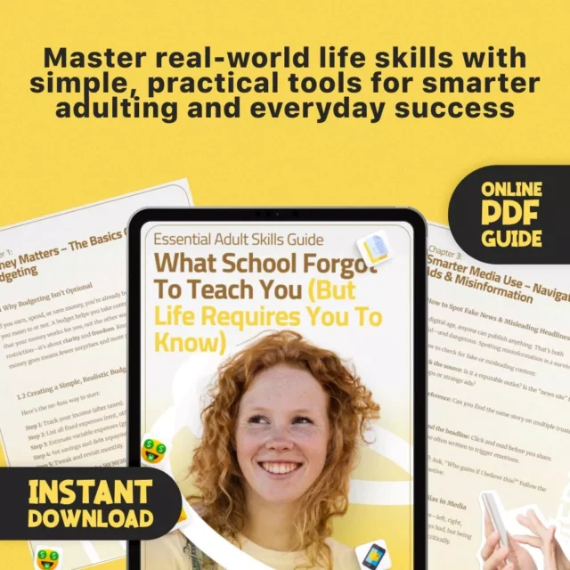 The Essential Adult Skills Guide is your go-to digital companion for mastering everyday responsibilities with clarity and confidence. Whether you’re launching into adulthood, juggling responsibilities, or just need a refresh, this guide is packed with actionable insights that make life less overwhelming and a lot more manageable. From budgeting to communication, media literacy to scheduling real-life tasks—you’ll get real answers to the questions no one teaches you in school.