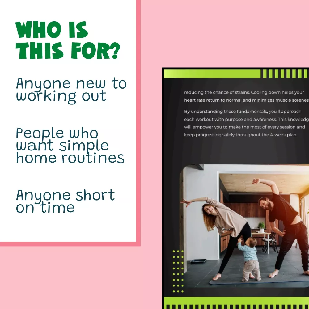 This guide is perfect for busy professionals, stay-at-home parents, students, or anyone looking for an affordable and doable way to get fit. If you’re seeking a detailed four-week exercise plan (eBook or PDF) requiring minimal equipment, with daily workouts, stretches, and rest suggestions for balanced fitness—this is for you.