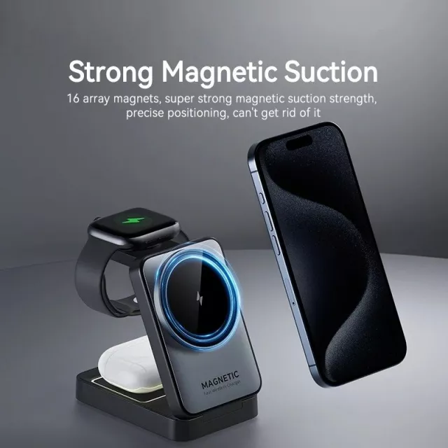 The stand delivers up to 15W fast charging for phones, 2.5W for smartwatches, and 5W for earbuds. Equipped with 16 strong magnets, it ensures a secure and precise hold for your devices. Its compact size of approximately 3.7 x 2.5 x 1.2 inches makes it as small as a computer mouse, yet powerful enough to be your portable mini power station.