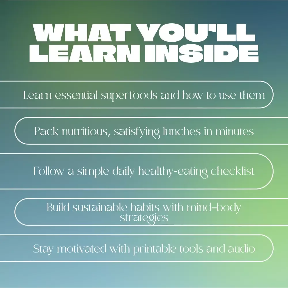 Anyone starting (or restarting) a healthy-eating journey who wants structure without strict rules. Busy professionals, students, and families needing quick, nutritious lunch ideas and practical planning tools. People who prefer straightforward guidance, printable checklists, and an encouraging audio companion.