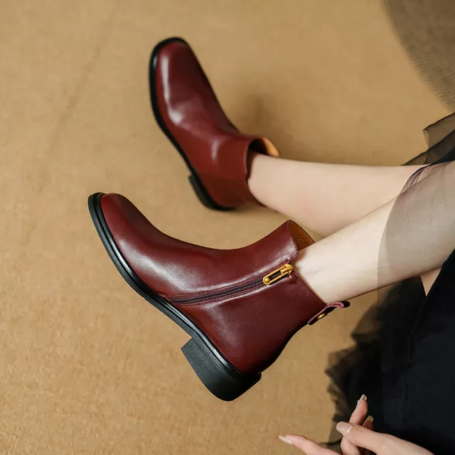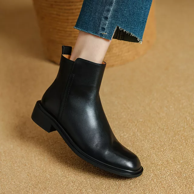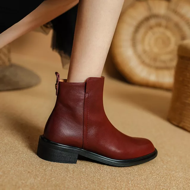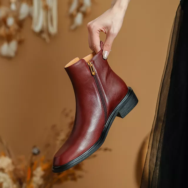 Step into timeless elegance with these genuine leather retro ankle boots, designed for women who value both fashion and comfort. Featuring a classic round toe, practical side zipper, and a sturdy 1.5-inch square heel, these boots add a chic touch to any outfit while providing all-day wearability. The soft short plush insole and genuine leather lining keep your feet cozy, making these boots a perfect choice for the cooler months.