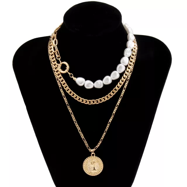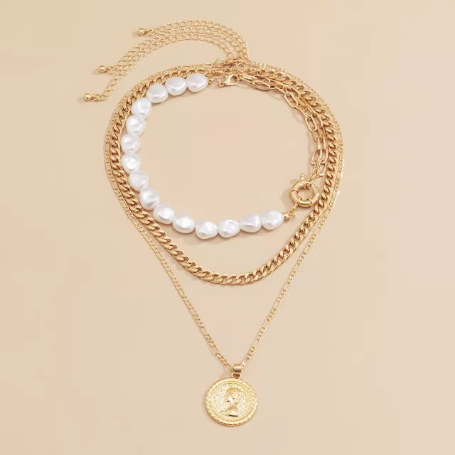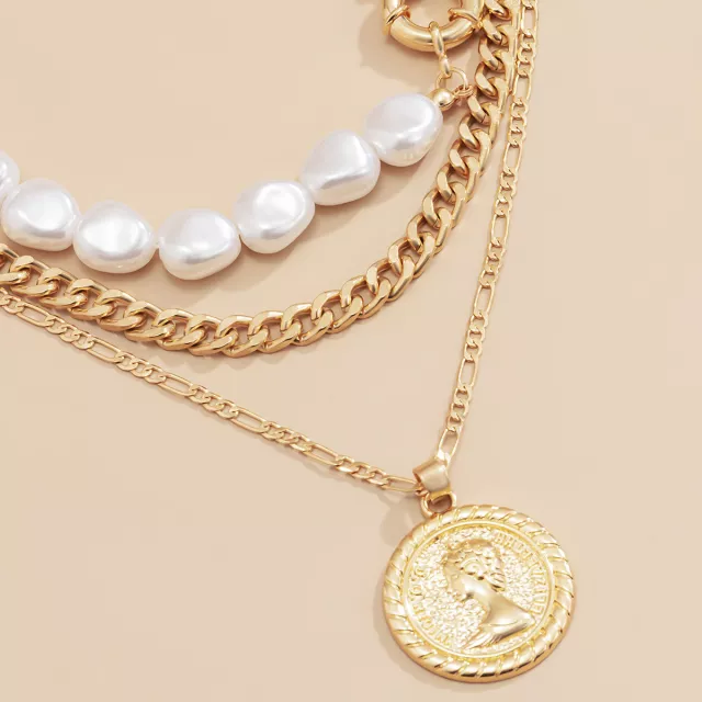 Turn heads with the perfect blend of vintage romance and rebellious spirit. This Gothic Baroque Multi-Layer Necklace Set features three striking pieces that layer effortlessly to create a bold, fashion-forward statement. With its intricate imitation pearl beading, detailed coin portrait pendant, and chunky link chains, this necklace adds instant attitude and allure to any outfit.
