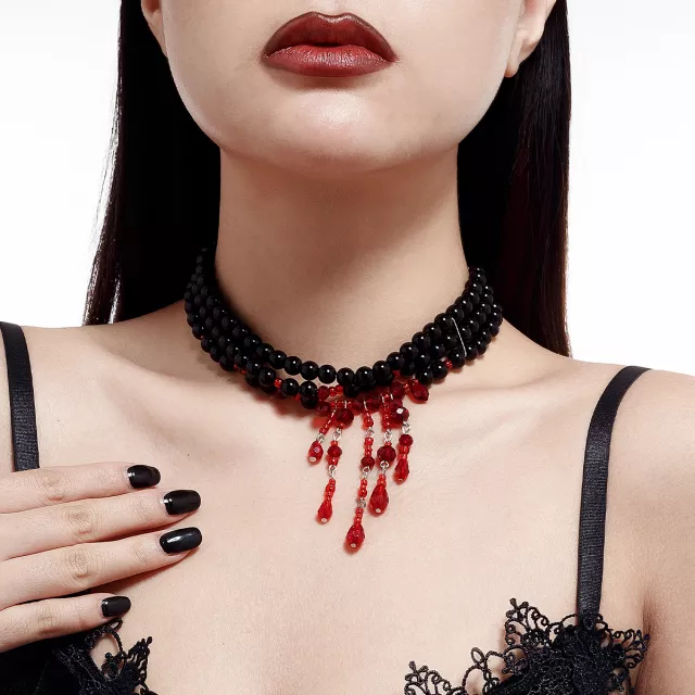 Its neo-Gothic design, detailed with delicate water drop patterns and beaded layers, evokes the charm of vintage gothic fashion with a modern edge. Whether you’re dressing up as a dark queen, a vampire siren, or simply want to add a bold twist to your outfit, this choker creates an unforgettable impression.
