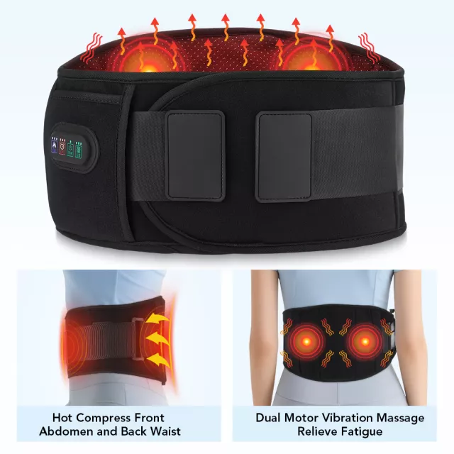 This advanced massaging belt heats up in just 5 seconds, delivering soothing warmth with infrared heat technology. Choose from three temperature settings (107°F, 113°F, or 127°F) and three vibration intensities to create your personalized massage experience. Dual motors target the waist with rhythmic pulses to relax tense muscles, while three built-in steel support plates reduce pressure and enhance posture throughout your day.