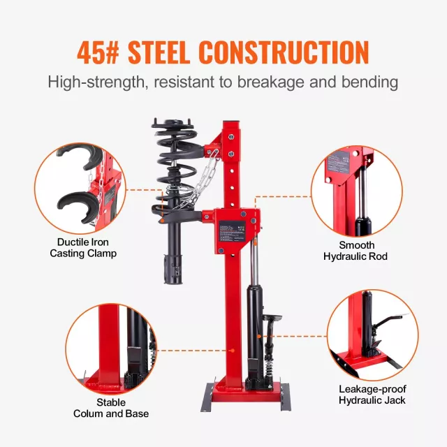 At the heart of this tool is a powerful 4.5-ton hydraulic jack paired with a rated compression force of 1 ton, giving you the strength to handle even the toughest suspension systems. The compressor features two versatile spring clasps—one for smaller springs (4.3”–5.1”) and another for larger ones (5.5”–6.7”), supported by eight adjustable column positions to accommodate various spring heights. A stable H-shaped base, extended safety chain, and integrated safety rod with locking positions ensure secure and steady operation during every job.