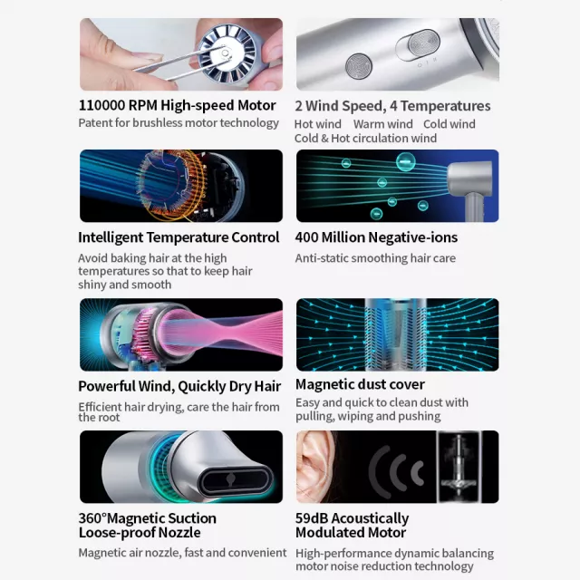 Experience salon-quality results at home or on the go with our High Speed Ionic Hair Dryer. Designed with a cutting-edge 110,000 RPM high-speed motor and advanced ionic technology, this dryer delivers lightning-fast drying while keeping your hair smooth, shiny and healthy. Whether you are getting ready for work, a night out, or packing for a trip, this lightweight and portable dryer is your perfect companion.
