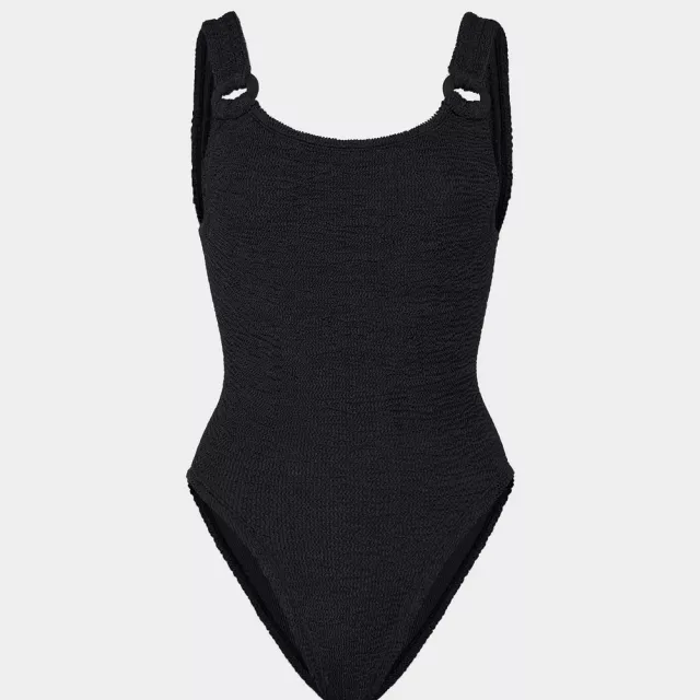 Turn heads with timeless style and feel confidently chic in the Hunza G Domino One-Piece Swimsuit. Crafted with Hunza G’s signature Original Crinkle fabric, this piece reinvents the classic swimsuit into a flattering, fashion-forward staple. The V-neckline at the front and subtle scoop at the back offer a balance of seduction and sophistication, while the eye-catching tortoiseshell ring straps give the suit a designer flair that stands out effortlessly on the beach or poolside.