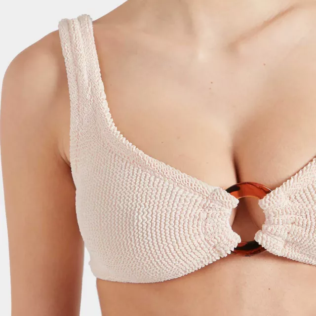 Featuring a flattering low-rise bottom and a sleek, off-the-shoulder top, the Julia bikini redefines elegance with its refined shape and thoughtful design. A unique cut-out detail at the front is accentuated by a tortoiseshell ring, adding just the right amount of visual interest to your poolside or beach look.