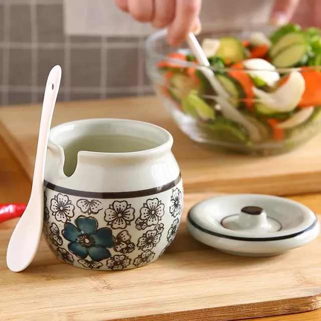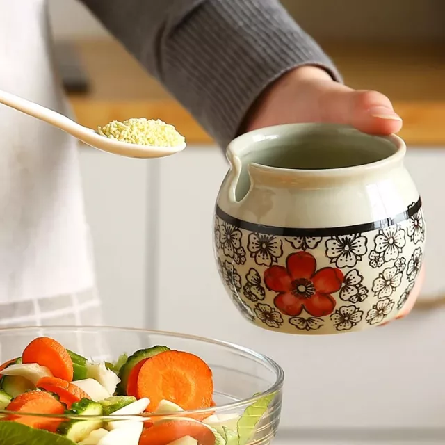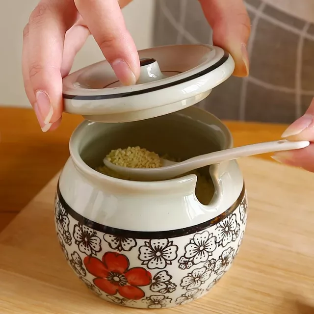 Inspired by traditional Japanese tableware, this seasoning jar features delicate floral patterns on smooth ceramic, adding timeless charm to your kitchen decor. The snug-fitting lid helps preserve flavor, freshness, and aroma, making it ideal for storing salt, pepper, sugar, herbs, or sauces. A compact size with a modern feel, it complements both rustic and contemporary spaces with ease.