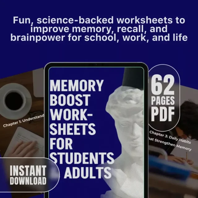Struggling to remember what you just read? Forgetting names, lists, or study material? The Memory Boost Worksheets for Students & Adults eBook is your all-in-one guide to mastering memory—no matter your age or lifestyle. Designed for busy students, professionals, lifelong learners, and even entire families, this digital download is more than just a guide. It’s a collection of practical memory-enhancing activities suitable for all ages, backed by science and easy to use in daily life. Whether you’re prepping for exams or aiming to stay sharp at work, this resource will help you train your brain and retain what matters.
