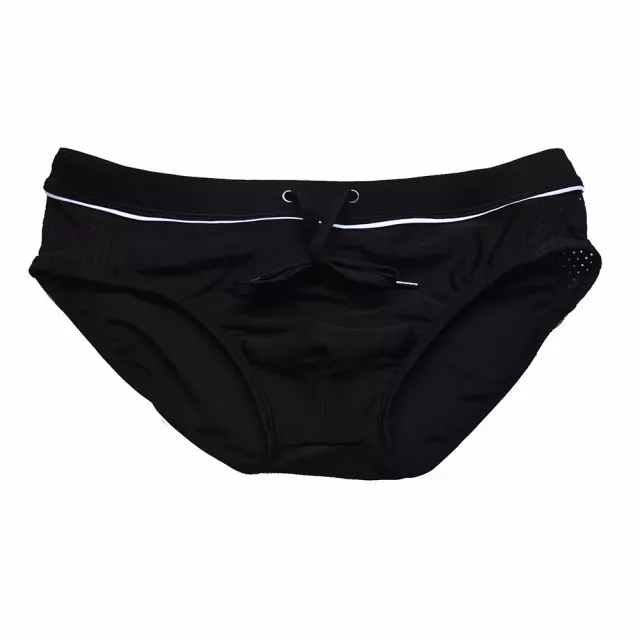 Crafted from a premium blend of 80% polyester and 20% spandex, they offer a snug yet flexible fit that moves with you. The smooth, breathable knit material hugs the body in all the right places while the daring low waist cut adds a provocative edge. The mesh cord detail brings in a sporty, modern vibe that sets you apart from the crowd. Designed in a bold solid black, these swim briefs are perfect for making a subtle yet striking statement.