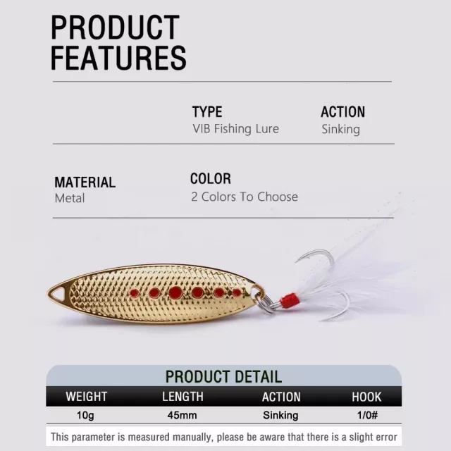 Bring out the predator in every fish with this high-performance Metal VIB Jig Spinner Spoon Fishing Lure. Designed to mimic the erratic movement of a wounded baitfish, this 2.05-inch (52mm), 0.35oz (10g) sinking wobbler combines flash, vibration, and irresistible action to attract strikes from even the most cautious game fish. Whether you’re casting into rivers, trolling the lake, or fishing the surf, this lure does it all – and does it better.