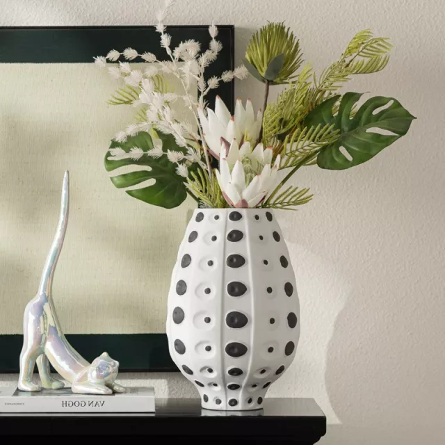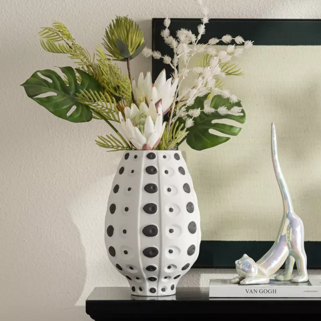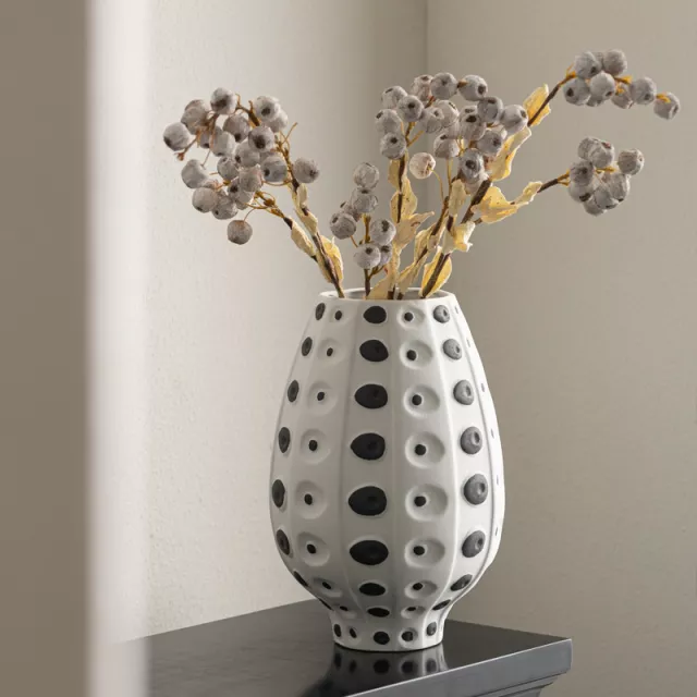 Crafted from high-quality ceramic, this vase features a durable structure with a smooth, glossy finish. The black and white speckled pattern is hand-applied, giving each vase a unique look with artistic charm. Sized to fit medium arrangements, it’s perfect for fresh flowers, dried blooms, or even as a standalone sculpture. This modern centerpiece enhances contemporary, minimalistic, and Scandinavian-inspired interiors, offering endless styling possibilities across seasons and moods.