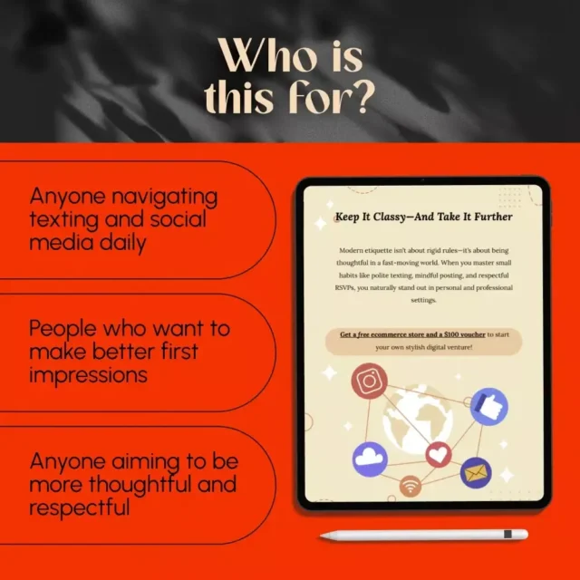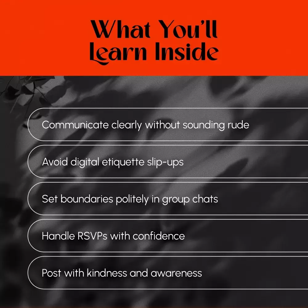 Unlike long or outdated etiquette manuals, the Modern Etiquette Micro-Course gives you fast, modern solutions to real-life digital dilemmas. With clear examples and real-world scenarios, it’s not about being perfect—it’s about being thoughtful and aware.